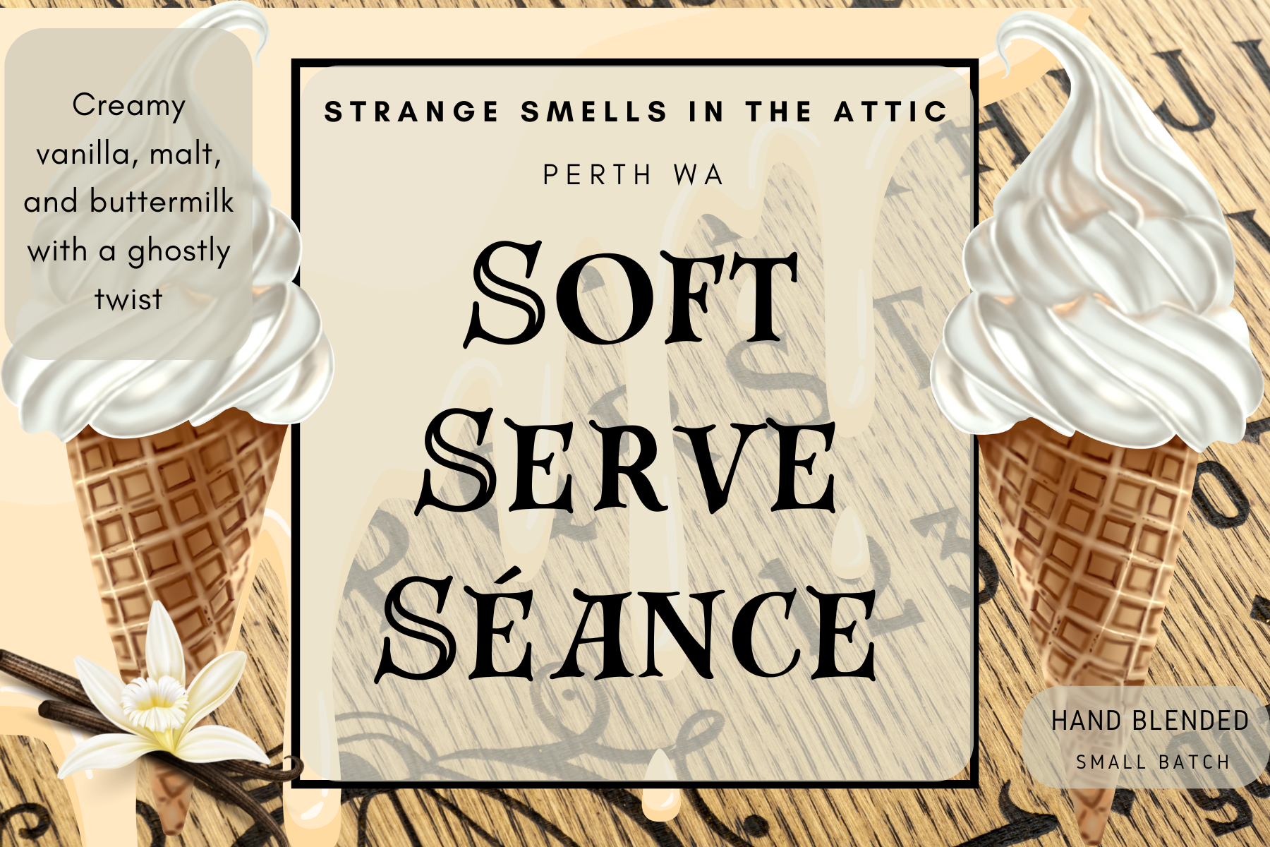 Soft Serve Séance swirls luxuriously creamy vanilla ice cream with buttery malt and sweet buttermilk, rich enough to tempt the living and the dead. A spark of ruby grapefruit and lime brightens the top, like candlelight flickering in a darkened parlour.